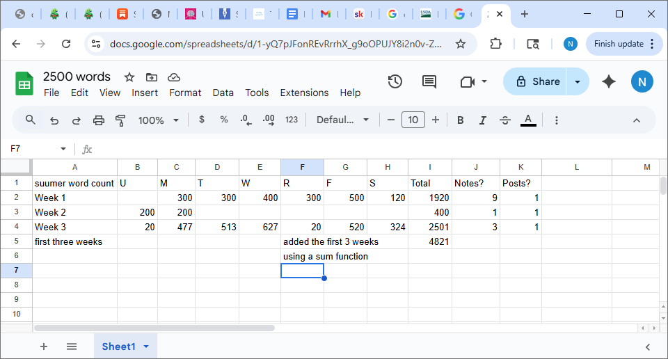 For example, I used Google Sheets to keep track of my words during the summer. (I got sick in June which explains my poor start.) Then I tallied the weekly totals in cells I2, I3, and I4, as shown below: